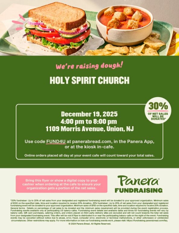Monetary Donation: Your financial support in the form of a monetary donation would be greatly appreciated. Any amount, whether big or small, will contribute to the success of our event. To make a donation or inquire about sponsorship opportunities, please feel free to contact me at parishoffice@holyspiritunion.org or 908-687-3327.